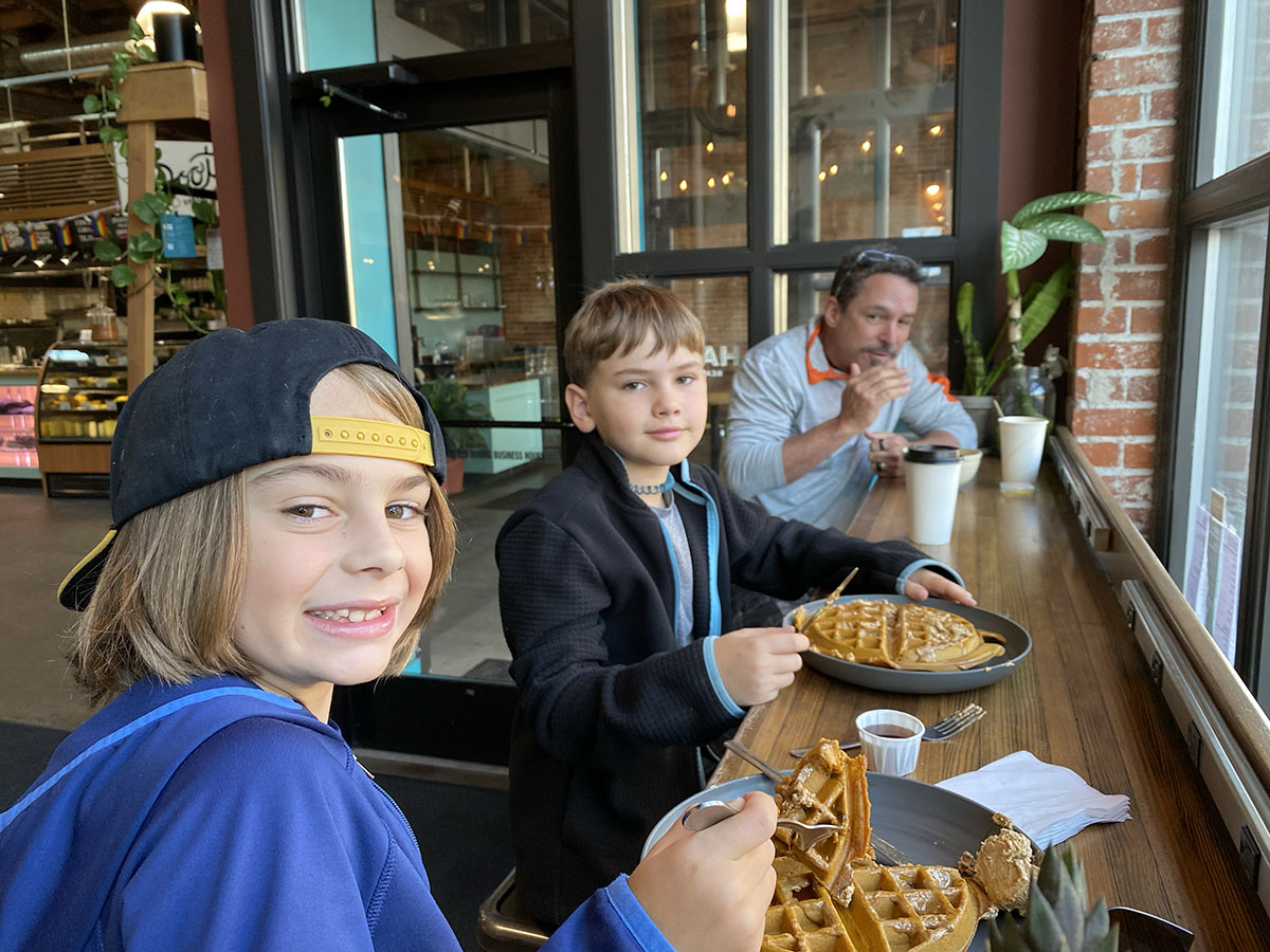 I started day 1 with an early morning walk through Gonzaga’s campus while Everest watched hotel cable cartoons (a rare pleasure). Then we met Mike and Miles for coffee and waffles, and shortly after met up with Kasim and his boys – Sammy and Ronin. They developed a unique playground game that the boys played (with Kasim) until it was time to hit the road. I had a beautiful moment watching them all play and engage.