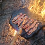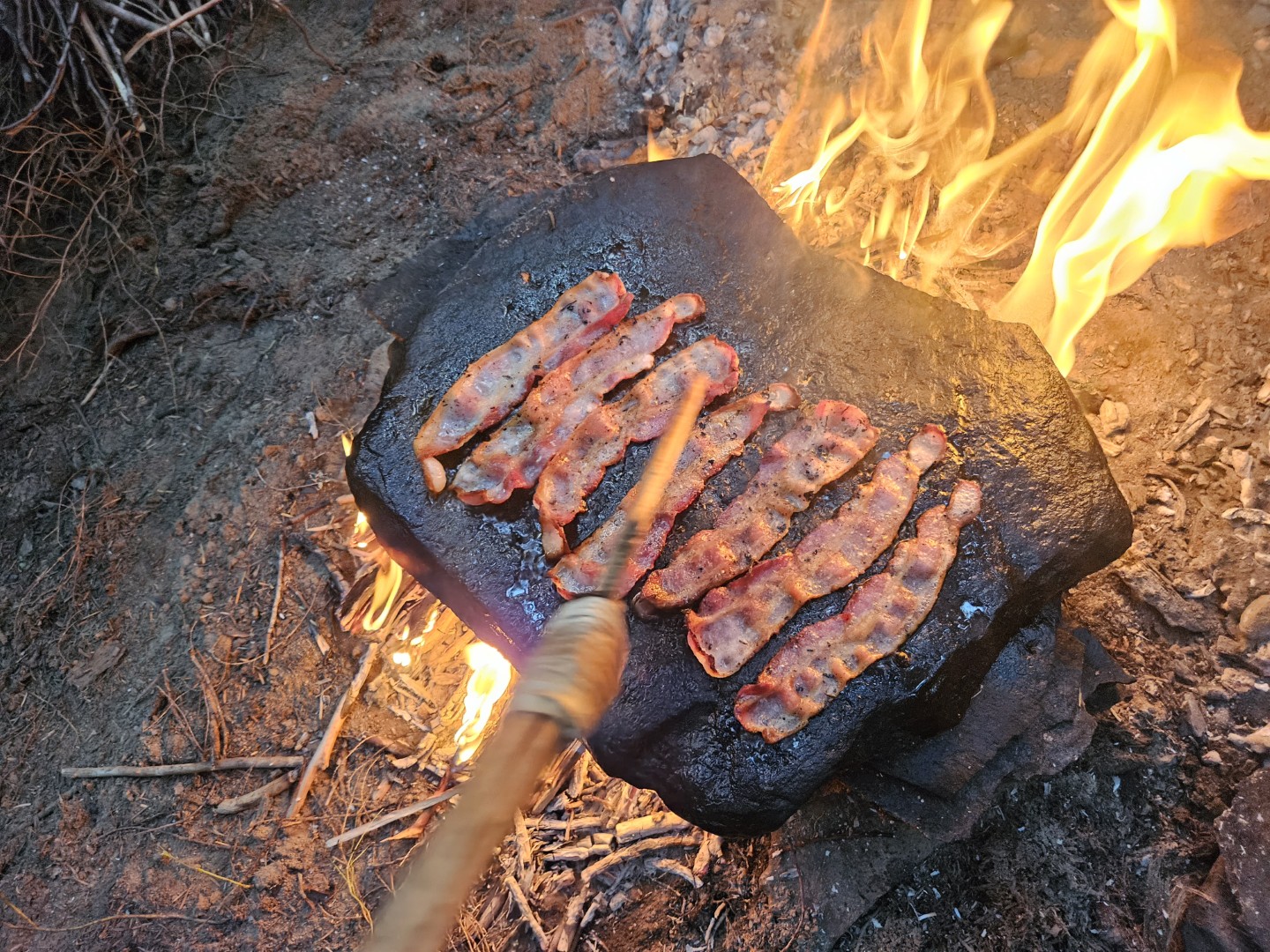 We got out of the shelter and joined the group down by the fire-pit. They were already in motion for the morning feast. This was another unique cookout that would require natural griddles. We needed something relatively flat to cook pancakes, bacon, sausage and eggs. Tim led the construction of rocks and small fires to power 4 stone griddles.